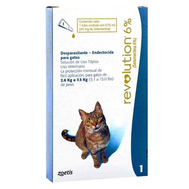 Revolution Gatos es un antiparasitario interno y externo de amplio espectro para gatos de 2;6 a 7;5 kg. Permite el control y tratamiento de parásitos eliminando pulgas adultas; larvas y previniendo la incubación de los huevos; ademas de controlar y tratar lombrices intestinales; Dirofilariasis y ácaros de la sarna.
